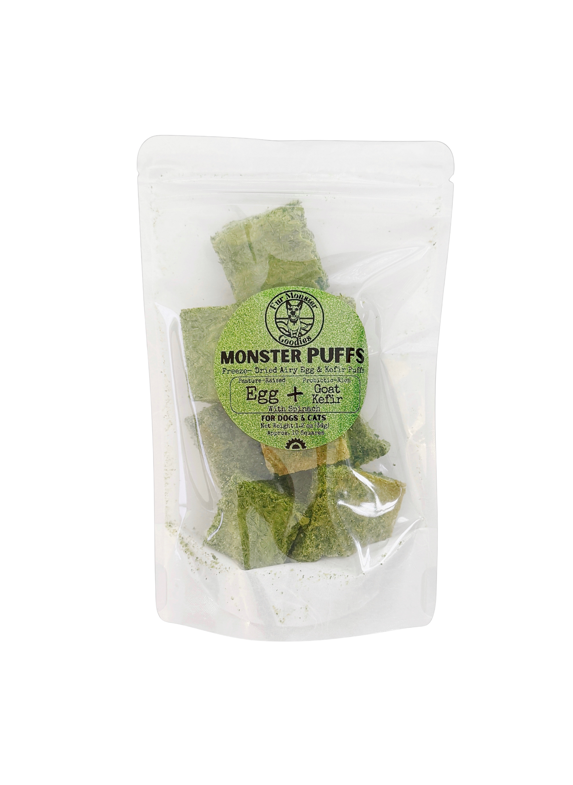 Light, airy, and thoughtfully-made, Monster Puffs are freeze-dried bites crafted from puréed organic pasture-raised eggs, goat kefir, and organic spinach. Each puff delivers clean, highly digestible protein alongside gut-loving probiotics, with nutrient-dense greens to support cellular health and everyday vitality. Naturally rich in minerals and phytonutrients, spinach provides an easy, gentle way to add greens to your pet’s routine.