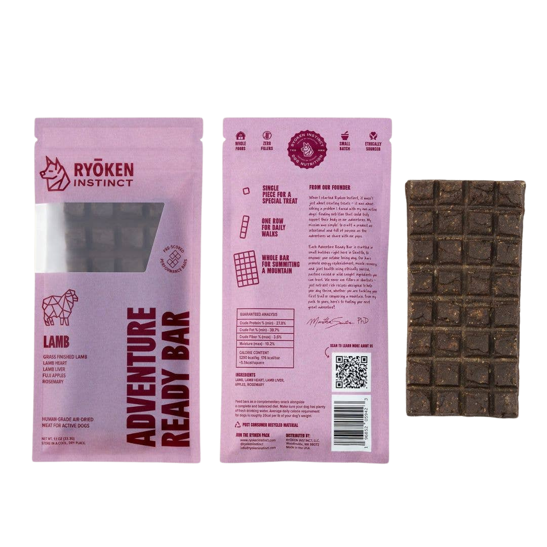 Fuel active dogs with Ryōken Instinct’s Lamb Adventure Ready Bar – a performance-focused bar crafted to support energy, stamina, and recovery. Made with grass-finished lamb, lamb liver, lamb heart, and Fuji apples, it delivers nutrient-dense fuel for hikes, training days, and travel.