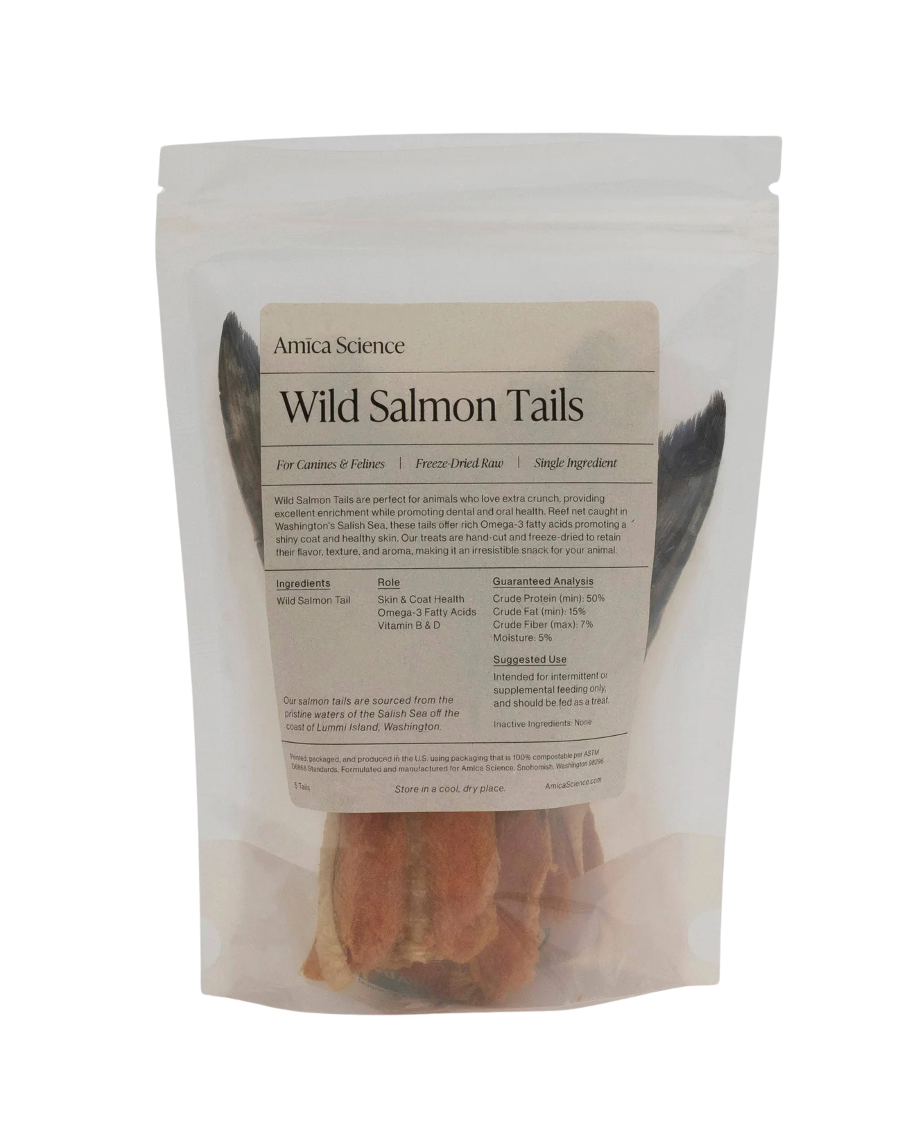 - Eco-Friendly Packaging: Salmon Tails are packaged in 100% compostable pouches, each component certified compostable individually. Manufactured in the USA, these pouches are vegan, non-GMO, and free from PLA. They are void of harmful chemicals like bisphenol (including BPA and more than a dozen derivatives), PFAS, or phthalates. Click here to learn more about Amica Science’s composting standards.